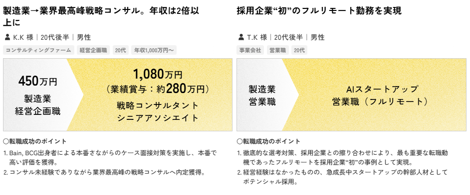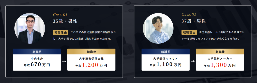 男性大手企業やベンチャー企業の案件も多いため、ハイクラス転職を目指していた自分にピッタリでした。