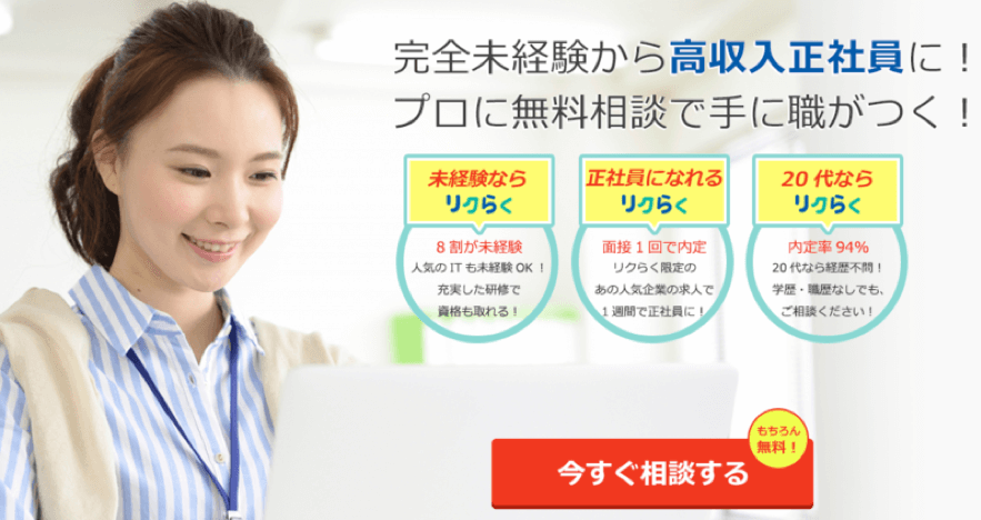 20代の既卒・フリーターで、東京・神奈川・千葉・埼玉に就職を希望する方は、無料で利用できるリクらくにまずは相談してみましょう。
