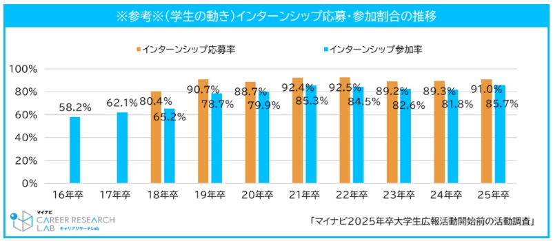 マイナビの調査によれば、2025年卒のインターンシップ応募率は91%となっており、学生が積極的に応募・参加していることがわかります。