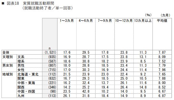 実質就職活動期間の割合を見てみると、就職活動が6ヵ月以内だったのは約47%となっており、学生の5割以上が7ヵ月以上就職活動を続けていたことがわかります。