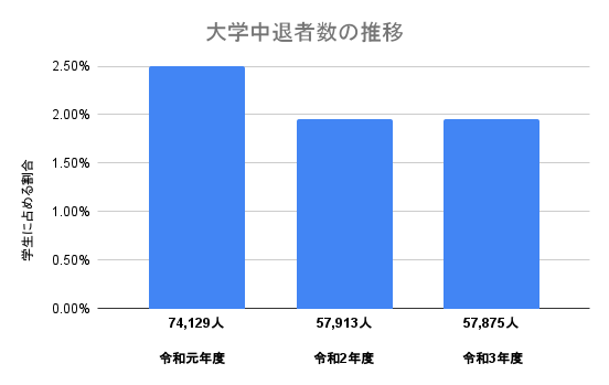 文部科学省によると、令和3年x度に大学を中退した方は約58,000人と報告されており、学生全体の約2%です。3年間で大学の退学者数は減少しています。
